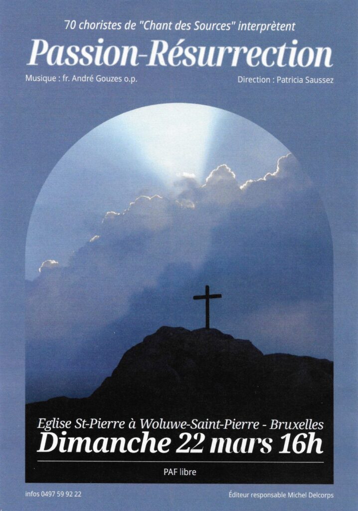 Dimanche 22 mars prochain à 16 heures, 70 choristes de « Chant des Sources » (issus de toute la Wallonie et même de France) interprèteront, sous la direction inspirée de Patricia Saussez, un concert-méditation à l’église St-Pierre de Woluwe-Saint-Pierre. Ce sera leur 4e opus, « Passion-Résurrection« , tissé comme toujours des chants de la « Liturgie Chorale du Peuple de Dieu » (musique du fr. A. Gouzes, o.p.), intégrant notamment l’intégrale de la Passion selon St-Jean.